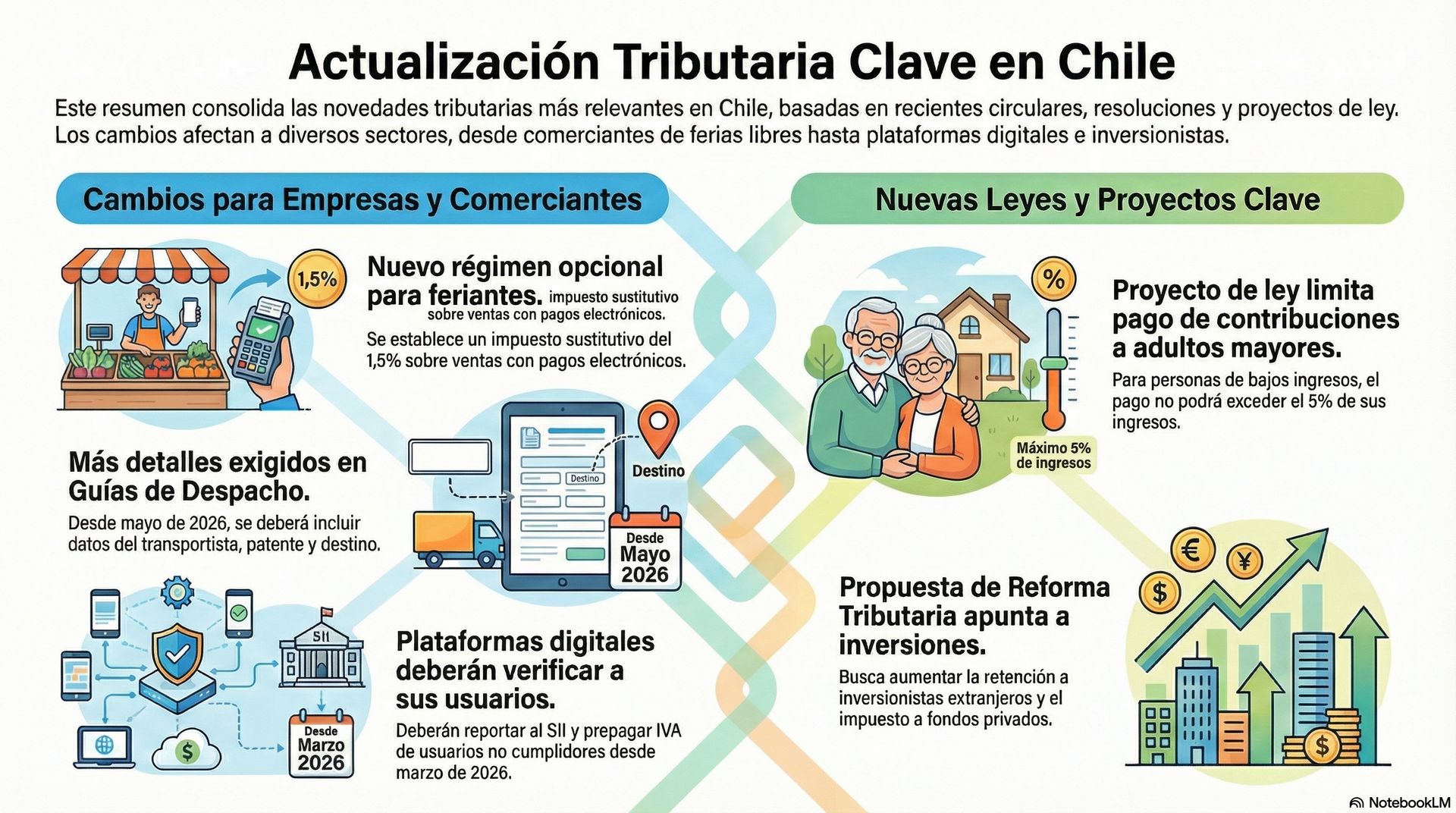 Ahí mismo, en vivo, tomé mi último boletín "Breves de Contabilidad", esas actualizaciones tributarias semanales que publico en LinkedIn, y se lo pasé a NotebookLM. En menos de un minuto, la IA generó una infografía profesional, visual y completamente compartible con todas las novedades tributarias clave de Chile.